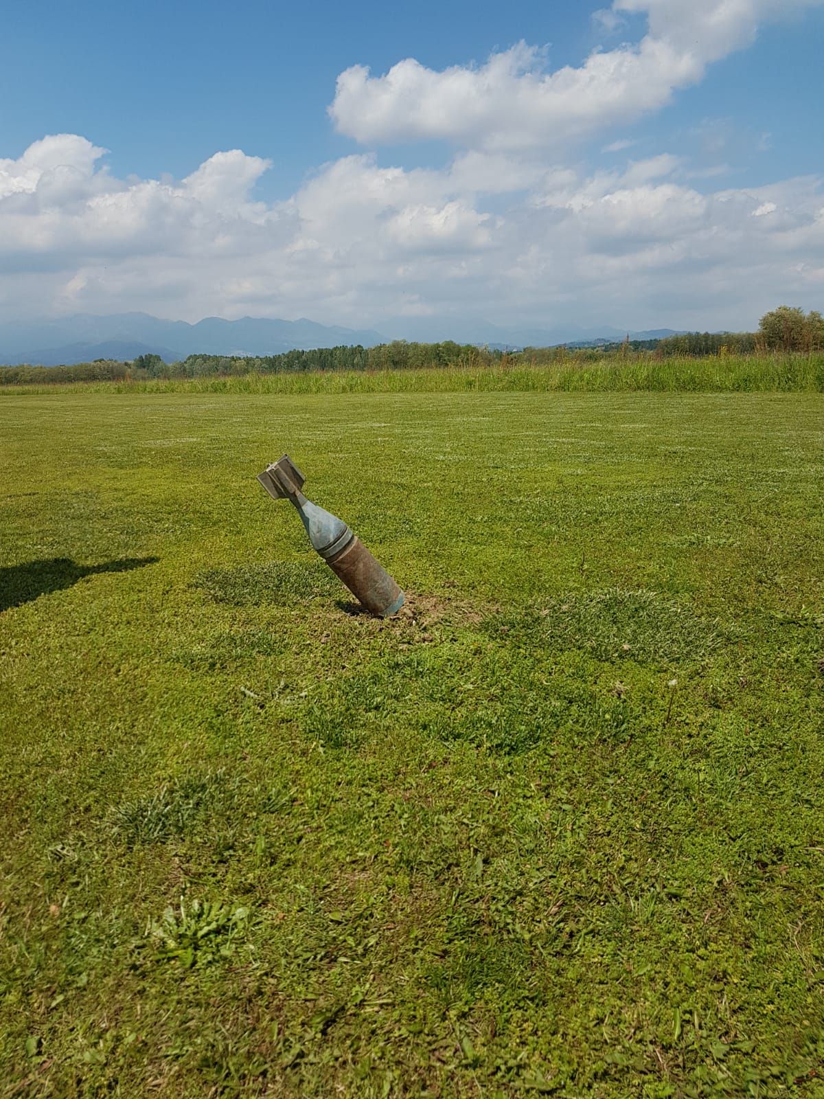 Un proietto da 105 millimetri, per fortuna inerte, è stato conficcato nel terreno, in modo che si potesse credere che fosse caduto dal cielo, nella pista di regione Pobbia, frazione Castellengo di Cossato, dove ha sede l’Aer.Bi, l’associazione aeromodellisti biellesi.