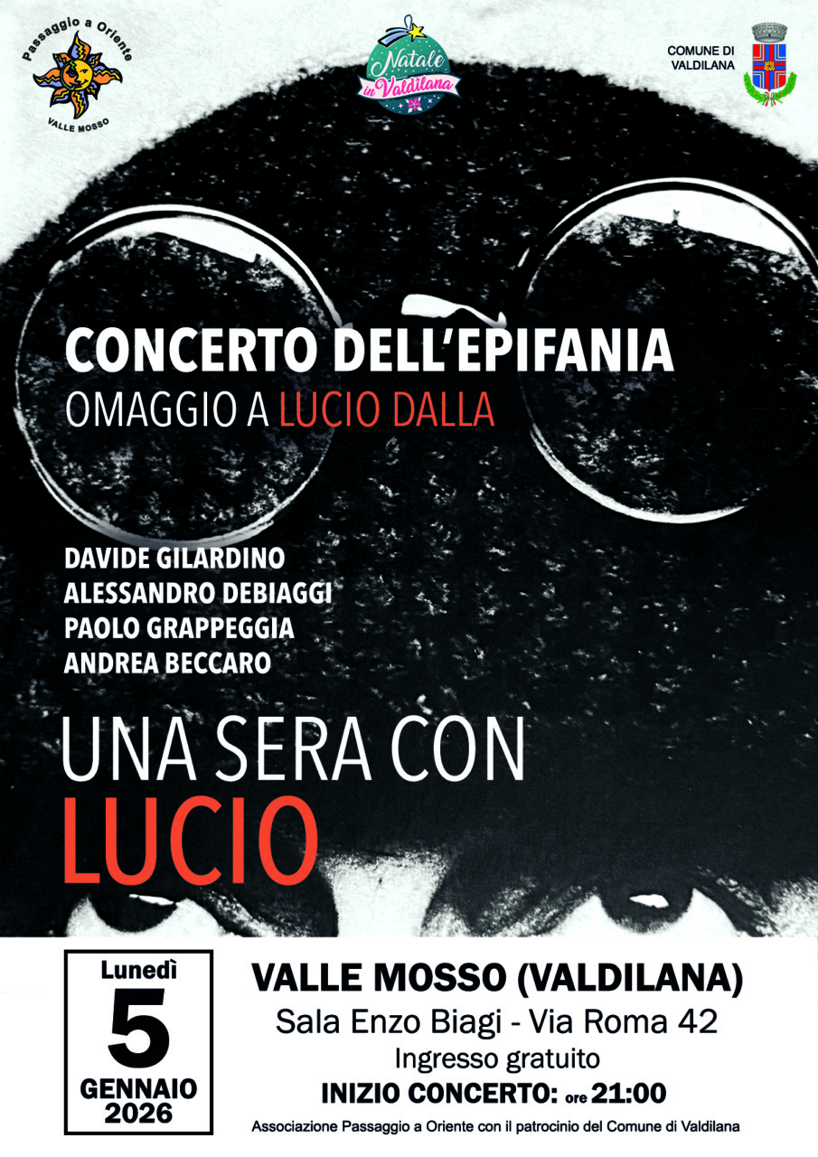 “Una serata con Lucio” è il filo conduttore della serata musicale a ingresso gratuito, che si terrà a Valle Mosso nella Sala Enzo Biagi di corso Roma 42, lunedì 5 gennaio, alle ore 21,00, in attesa dell’arrivo della Befana. L’omaggio è proposto da un quartetto in cui spicca la voce del biellese Davide Gilardino; con lui Alessandro Debiaggi al pianoforte e tastiera, Paolo Grappeggia al contrabbasso e Andrea Beccaro alla batteria.