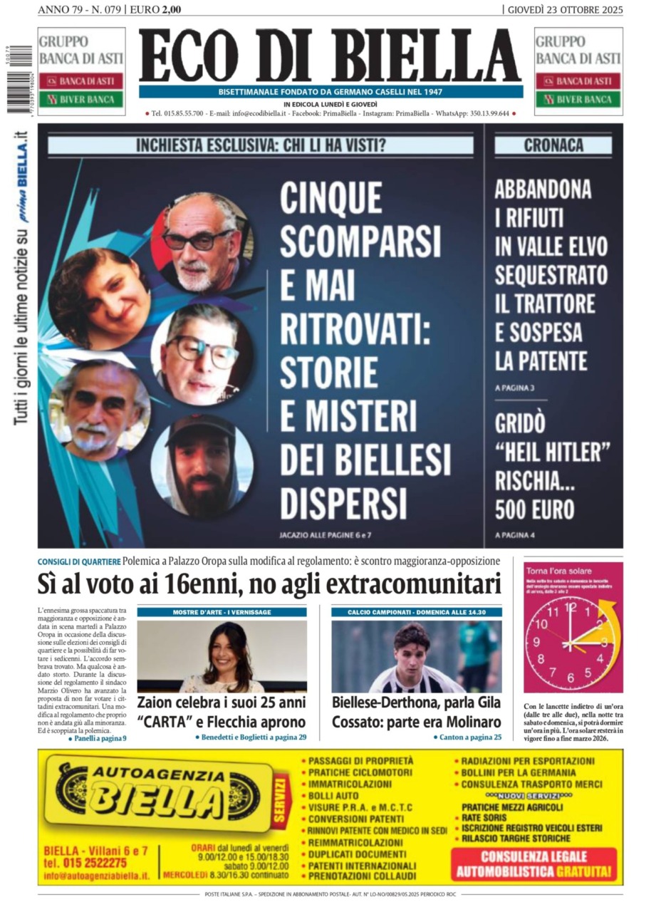Eco di Biella torna in edicola oggi, giovedì 23 ottobre, con tante notizie e approfondimenti, tra cui in apertura: Cinque scomparsi e mai ritrovati: storie e misteri dei biellesi dispersi. Inchiesta esclusiva: chi li ha visti? Cronaca, abbandona i rifiuti in Valle Elvo, sequestrato il trattore e sospesa la patente. Gridò “Heil Hitler”, rischia… 500 euro.