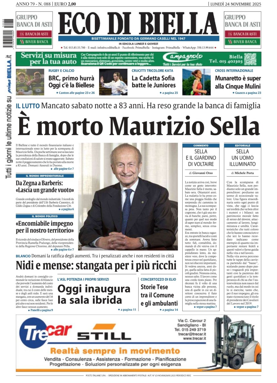 Eco di Biella torna in edicola oggi, lunedì 24 novembre, con tante notizie e approfondimenti, tra cui in apertura: “È morto Maurizio Sella”. Il Biellese e tutto il mondo finanziario italiano e internazionale sono in lutto per la scomparsa di Maurizio Sella. Da poche settimane aveva lasciato la presidenza della Banca di famiglia, dopo che le sue condizioni di salute si erano aggravate. Sabato notte il peggioramento che lo ha portato alla morte a 83 anni. Domani i funerali in Duomo.