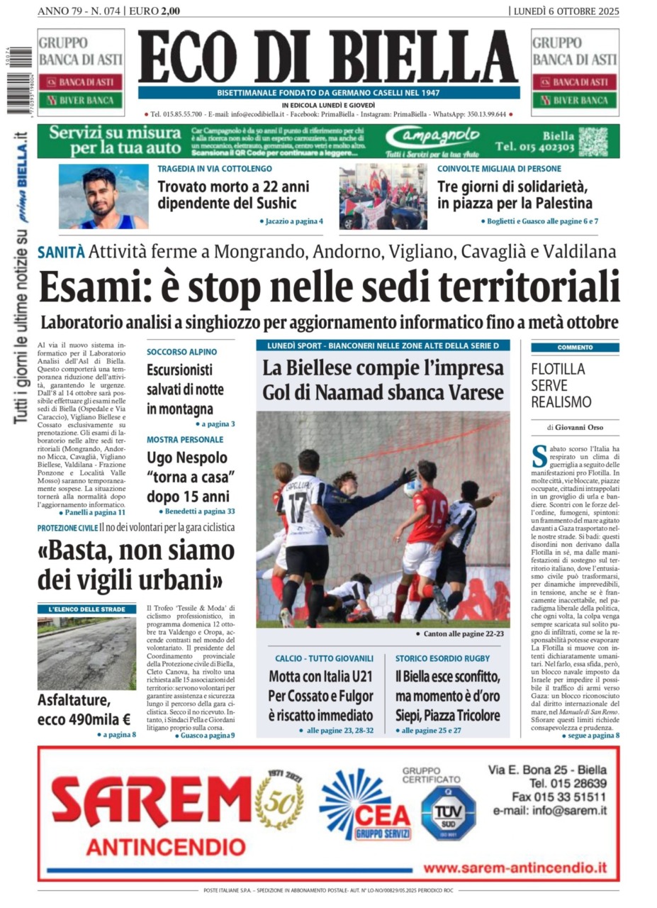 Eco di Biella torna in edicola oggi, lunedì 6 ottobre, con tante notizie e approfondimenti, tra cui in apertura: “Esami: è stop nelle sedi territoriali”. Al via il nuovo sistema informatico per il Laboratorio Analisi dell’Asl di Biella. Questo comporterà una temporanea riduzione dell’attività, garantendo le urgenze. Dall’8 al 14 ottobre sarà possibile effettuare gli esami nelle sedi di Biella (Ospedale e Via Caraccio), Vigliano Biellese e Cossato esclusivamente su prenotazione. Gli esami di laboratorio nelle altre sedi territoriali (Mongrando, Andorno Micca, Cavaglià, Vigliano Biellese, Valdilana – Frazione Ponzone e Località Valle Mosso) saranno temporaneamente sospese. La situazione tornerà alla normalità dopo l’aggiornamento informatico.