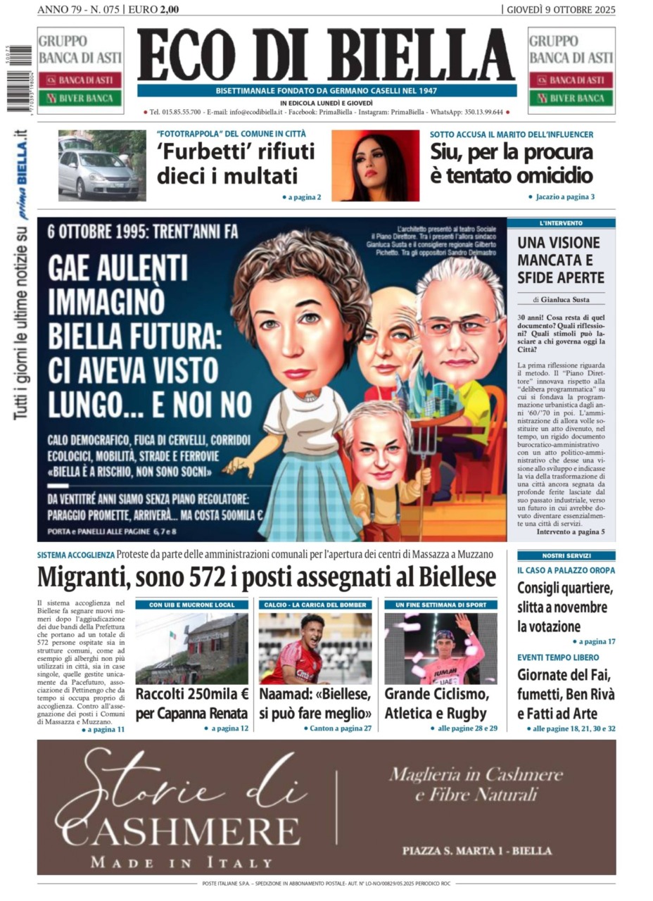 Eco di Biella torna in edicola oggi, giovedì 9 ottobre, con tante notizie e approfondimenti, tra cui in apertura: “Gae Aulenti immaginò Biella futura: ci aveva visto lungo… e noi no”. Calo demografico, fuga di cervelli, corridoi ecologici, mobilità, strade e ferrovia. “Biella è a rischio, non sono sogni”. Da ventitrè anni siamo senza piano regolatore: paraggio promette, arriverà… ma costa 500mila euro. L’intervento, una visione mancata e sfide aperte.