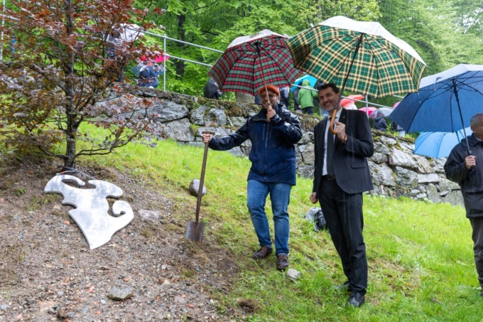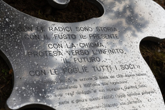 Dopo l’omaggio a Quintino Sella, la mattinata del Cai a Oropa si è conclusa nel piazzale Busancano con la messa a dimora di un faggio rosso, idealmente collocato alla partenza dei sentieri per la montagna “simbolo” del Mucrone, in onore dei 150 anni del  Cai sezione di Biella. Al fusto dell’albero è legata una foglia metallica, con una dedica “𝑎𝑖 𝑠𝑜𝑐𝑖 𝑐ℎ𝑒 𝑛𝑒 ℎ𝑎𝑛𝑛𝑜 𝑠𝑐𝑟𝑖𝑡𝑡𝑎 𝑙𝑎 𝑠𝑡𝑜𝑟𝑖𝑎, 𝑎𝑖 𝑠𝑜𝑐𝑖 𝑐ℎ𝑒 𝑠𝑡𝑎𝑛𝑛𝑜 𝑠𝑐𝑟𝑖𝑣𝑒𝑛𝑑𝑜 𝑝𝑎𝑔𝑖𝑛𝑒 𝑛𝑢𝑜𝑣𝑒, 𝑒 𝑎𝑖 𝑠𝑜𝑐𝑖 𝑐ℎ𝑒 𝑛𝑜𝑛 𝑠𝑜𝑛𝑜 𝑚𝑎 𝑠𝑎𝑟𝑎𝑛𝑛𝑜”, e un pensiero in particolare agli undici soci biellesi ebrei che vennero epurati nel 1939 con le Leggi razziali. La targa è stata realizzata dall’artista Paolo Barrichello.