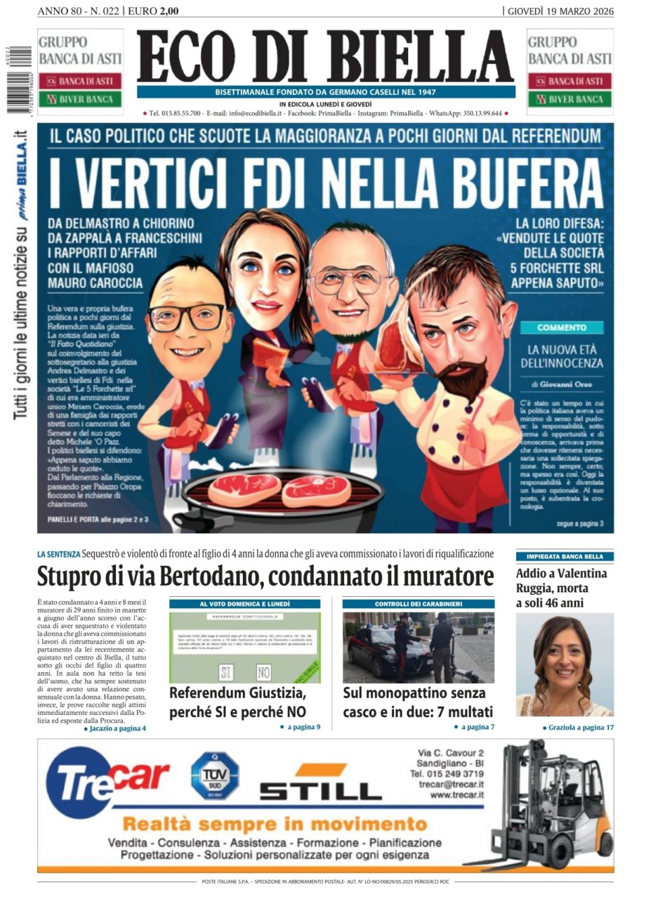 Eco di Biella torna in edicola oggi, giovedì 19 marzo, con tante notizie e approfondimenti, tra cui in apertura: “I vertici Fdi nella bufera”. Il caso politico che scuote la maggiornza a pochi giorni dal referendum. Da Delmastro a Chiorino, da Zappalà a Franceschini, i rapporti d’affari con il mafioso Mauro Caroccia. La loro difesa: “Vendute le quote della società 5 Forchette srl appena saputo”.