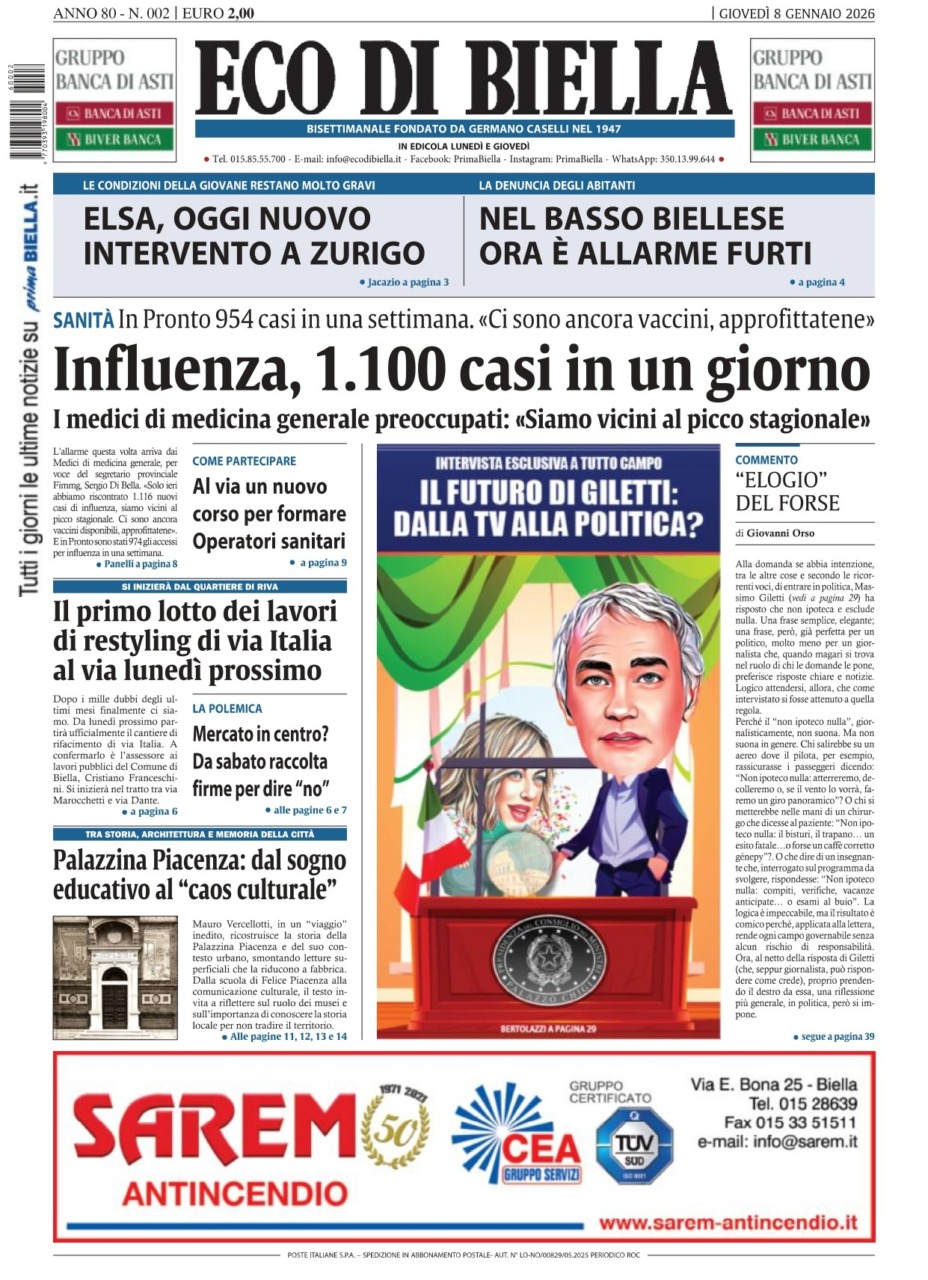 Eco di Biella torna in edicola oggi, giovedì 8 gennaio, con tante notizie e approfondimenti, tra cui in apertura: “Influenza, 1100 casi in un giorno”. L’allarme questa volta arriva dai Medici di medicina generale, per voce del segretario provinciale Fimmg, Sergio Di Bella. «Solo ieri abbiamo riscontrato 1.116 nuovi casi di influenza, siamo vicini al picco stagionale. Ci sono ancora vaccini disponibili, approfittatene». E in Pronto sono stati 974 gli accessi per influenza in una settimana.