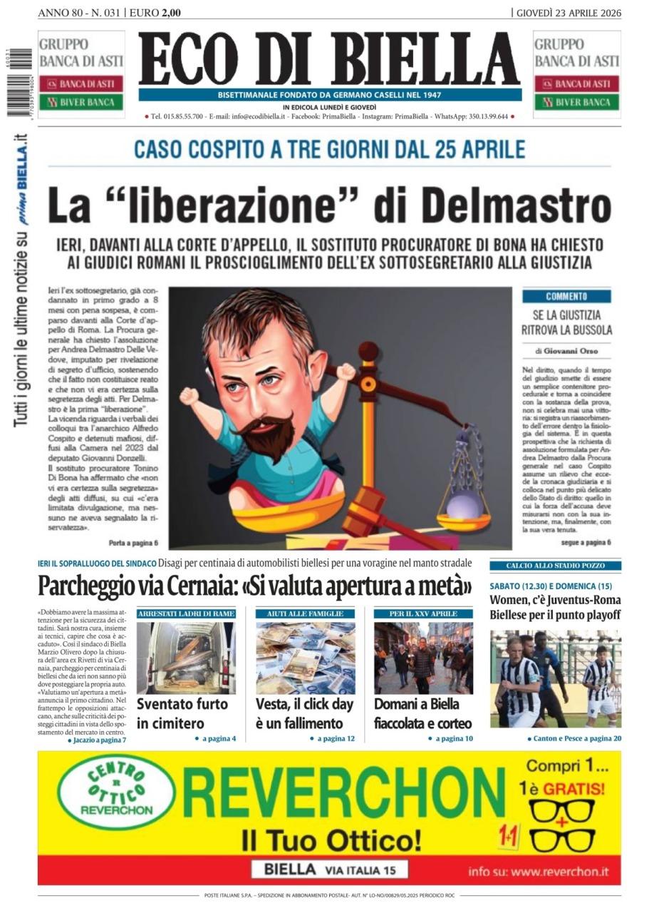 Eco di Biella torna in edicola oggi, giovedì 23 aprile, con tante notizie e approfondimenti, tra cui in apertura: “La ‘liberazione’ di Delmastro”. Caso Cospito a tre giorni dal 25 aprile. Ieri, davanti alla Corte d’appello, il sostituto procuratore Di Bona ha chiesto ai giudici romani il proscioglimento dell’ex sottosegretario alla giustizia.