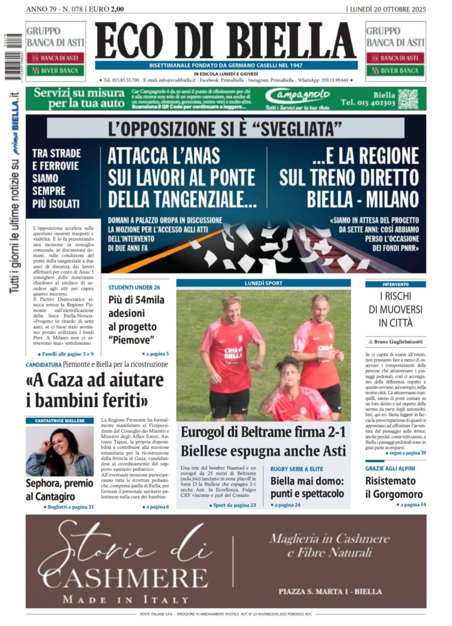 Eco di Biella torna in edicola oggi, giovedì 16 ottobre, con tante notizie e approfondimenti, tra cui in apertura: l’opposizione si è ‘svegliata’. Attacca l’Anas su lavori al ponte della tangenziale. Domani a Palazzo Oropa in discussione la mozione per l’accesso agli atti dell’intervento di due anni fa. …e la Regione sul treno diretto Biella – Milano. “Siamo in attesa del progetto da sette anni: così abbiamo perso l’occasione dei fondi Pnrr.