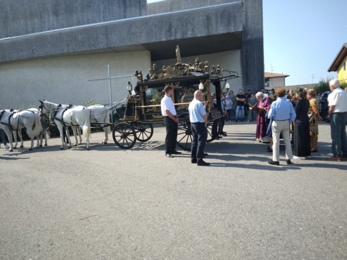 La salma è arrivata nel piazzale antistante la chiesa (nelle foto Paiato), accompagnata dai familiari, ma, anziché sul consueto carro funebre, è stata trasportata, da casa sua, in via Vercellotto 227, a bordo di un’antica e splendida carrozza nera, con stupende decorazioni giallo oro, trainata da quattro cavalli bianchi, come si faceva, di solito, per i funerali, fino ad oltre 60 anni fa. Anche il cocchiere era in alta uniforme.