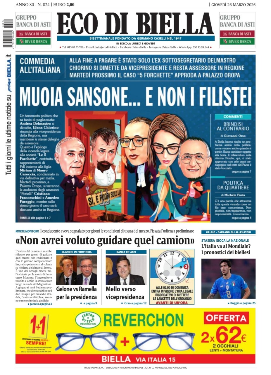 Eco di Biella torna in edicola oggi, giovedì 26 marzo, con tante notizie e approfondimenti, tra cui in apertura: “Muoia Sansone… e non i filistei”. Alla fine a pagare è stato solo l’ex sottosegretario Delmastro. Chiorino si dimette da vicepresidente e resta assessore in Regione. Martedì prossimo il caso “5 forchette” approda a Palazzo Oropa.