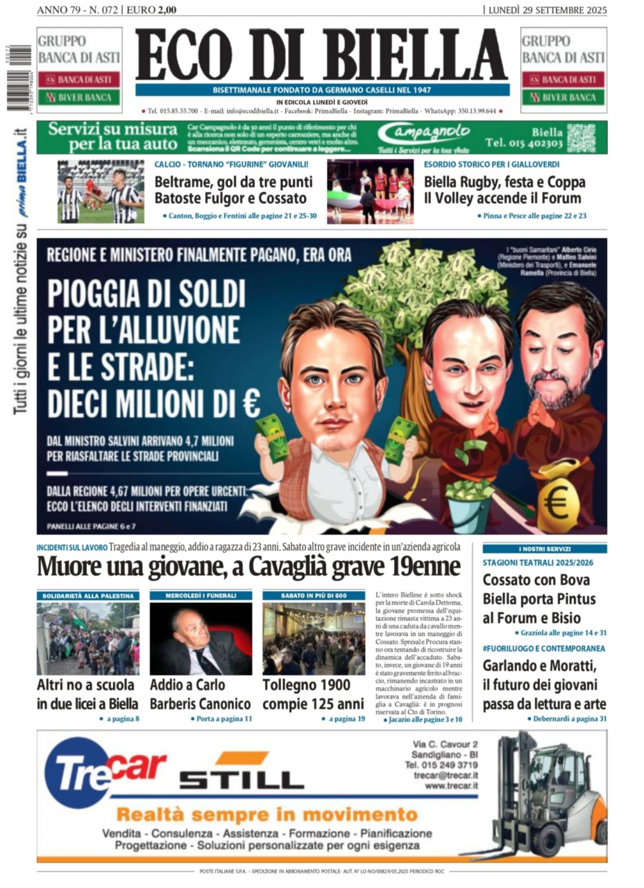 Eco di Biella torna in edicola oggi, lunedì 29 settembre, con tante notizie e approfondimenti, tra cui in apertura: Pioggia di soldi per l’alluvione e le strade: dieci milioni di euro”. Dal ministro Salvini arrivano 4,7 milioni per riasfaltare le strade provinciali. Dalla Regione 4,67 milioni per opere urgenti. L’elenco degli interventi finanziati.