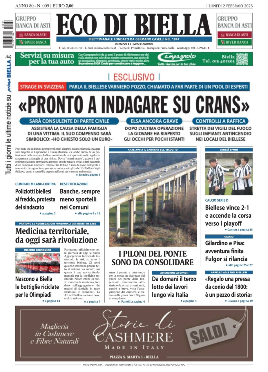 Eco di Biella torna in edicola oggi, lunedì 2 febbraio, con tante notizie e approfondimenti, tra cui in apertura: “Pronto a insagare su Crans-Montana”. Fra i nomi che andranno a comporre il team di esperti italiani chiamati a indagare sulla tragedia di Capodanno a Crans-Montana, c’è anche quello di un professionista della sicurezza biellese, contattato da un importante studio legale che rappresenta la famiglia di una vittima. Dovrà “tenersi pronto”, qualora il procedimento dovesse approdare a processo in sede penale e civile: lo farà in cambio di un compenso simbolico. Intanto Elsa Rubino è stata di nuovo sottoposta a intervento chirurgico. Resta gravissima ma ha aperto gli occhi. Nel Biellese i Vigili del fuoco pronti a controlli a tappeto nei locali per le norme antincendio.