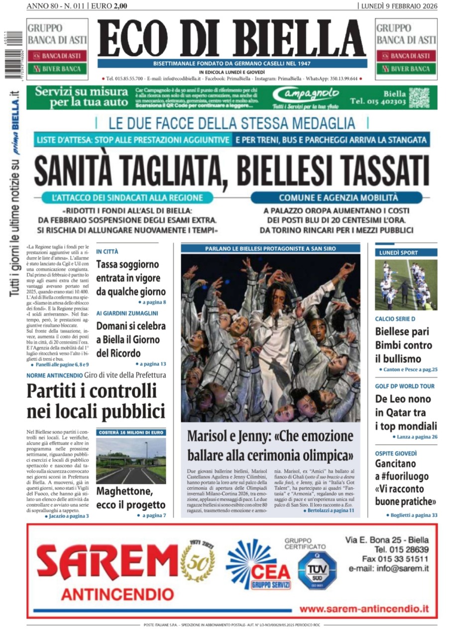 Eco di Biella torna in edicola oggi, lunedì 9 febbraio, con tante notizie e approfondimenti, tra cui in apertura: “Sanità tagliata, Biellesi tassati”. «La Regione taglia i fondi per le prestazioni aggiuntive utili a ridurre le liste d’attesa». L’allarme è stato lanciato da Cgil e Uil con una comunicazione congiunta. Dal primo di febbraio è partito lo stop agli esami extra che tanti vantaggi avevano portato nel 2025, quando erano stati 10.400. L’Asl di Biella conferma ma spiega: «Siamo in attesa dello sblocco dei fondi». E la Regione precisa: «I soldi arriveranno». Nel frattempo, però, le prestazioni aggiuntive risultano bloccate.