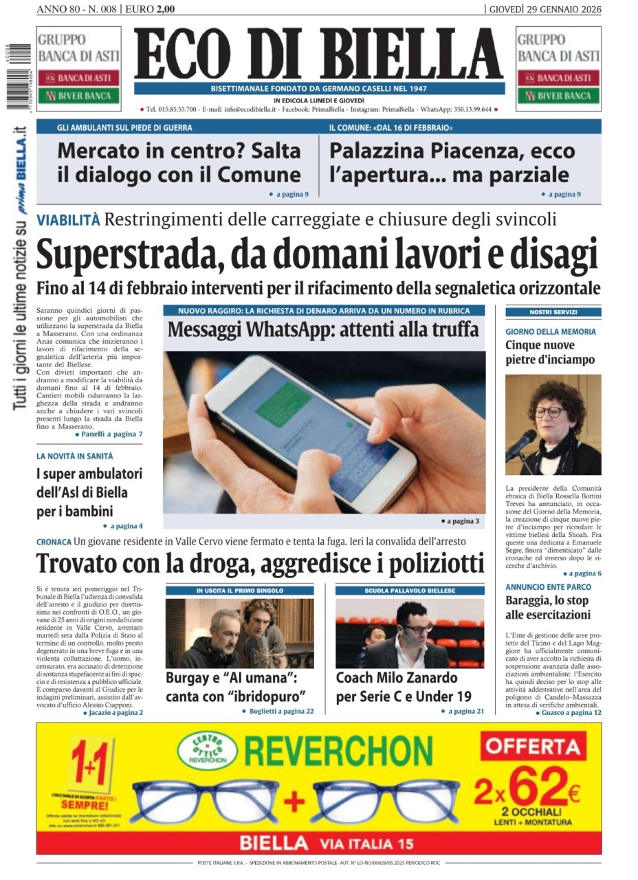 Eco di Biella torna in edicola oggi, giovedì 29 gennaio, con tante notizie e approfondimenti, tra cui in apertura: “Superstrada, da domani lavori e disagi”. Saranno quindici giorni di passione per gli automobilisti che utilizzano la superstrada da Biella a Masserano. Con una ordinanza Anas comunica che inizieranno i lavori di rifacimento della segnaletica dell’arteria più importante del Biellese.