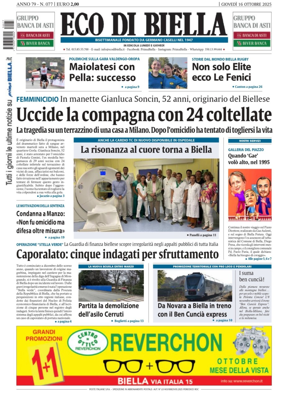 Eco di Biella torna in edicola oggi, giovedì 16 ottobre, con tante notizie e approfondimenti, tra cui in apertura: “Uccide la compagna con 24 coltellate”. È originario di Biella il protagonista del drammatico fatto di sangue avvenuto martedì sera a Milano, nel quartiere Gorla. Gianluca Soncin, 52 anni, è stato arrestato per l’omicidio di Pamela Genini, l’ex modella bergamasca di 29 anni uccisa con 24 coltellate infertele sul terrazzino di casa sua sotto gli sguardi sgomenti dei vicini di casa, affacciatisi sui balconi, e delle forze dell’ordine, che hanno fatto irruzione nell’appartamento per tentare di fermare questo gesto ingiustificabile. Subito dopo l’aggressione, l’uomo ha tentato di togliersi la vita colpendosi a sua volta alla gola.