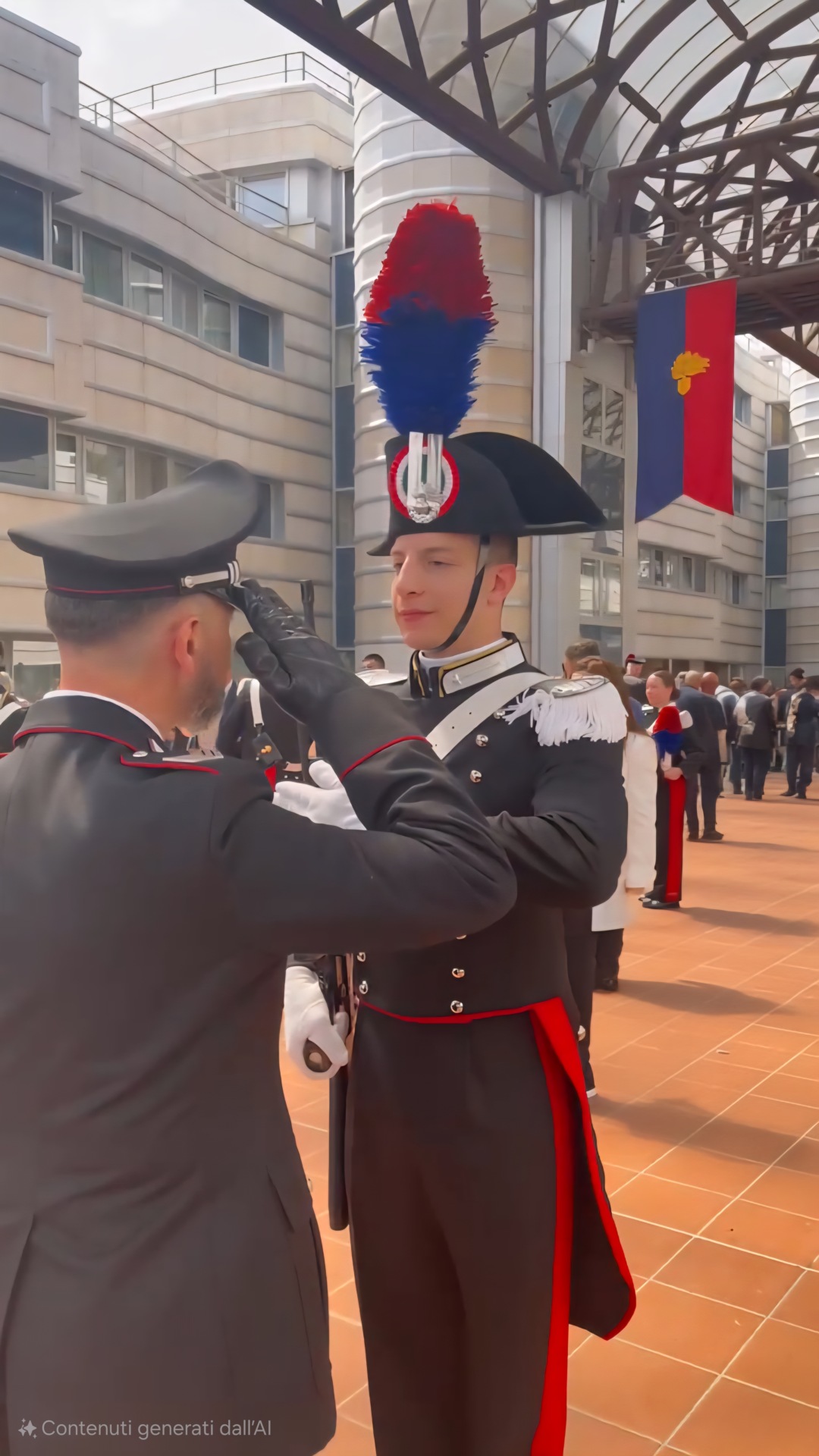 Il momento più toccante della cerimonia è stato il conferimento degli Alamari, i caratteristici ornamenti in argento che simboleggiano l’ingresso nella vita operativa di un Carabiniere. A rendere ancora più speciale l’evento, il fatto che sia stato proprio il padre Stefano a cucire simbolicamente quegli alamari sul colletto della divisa del figlio: un gesto che unisce il rigore della tradizione militare al calore dei legami familiari.