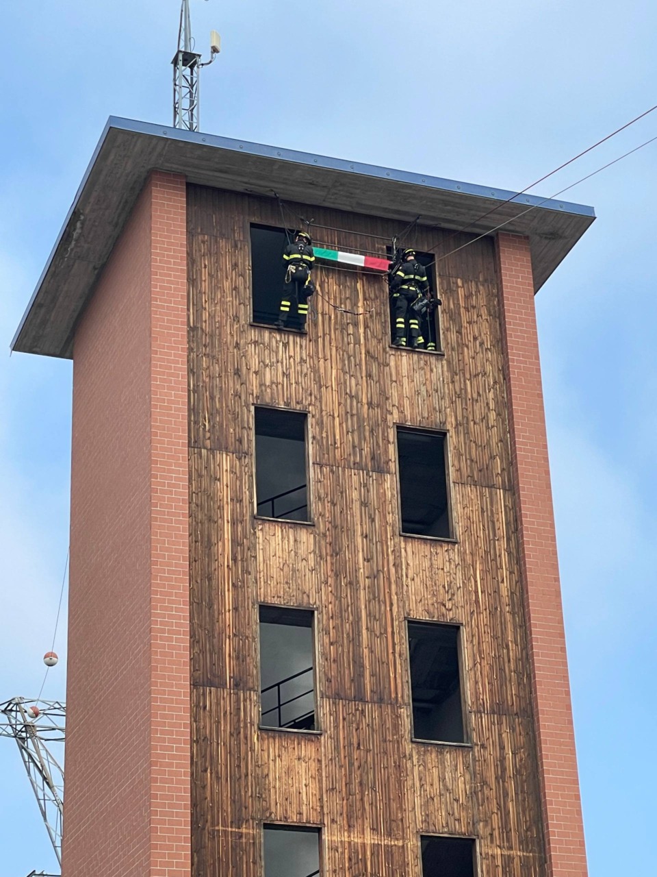 La mattinata si è aperta con un momento operativo e  dimostrativo che ha preceduto la consegna dei riconoscimenti al personale in servizio e in quiescenza.  In particolare l’esecuzione dell’inno nazionale ha accompagnato il dispiegamento del Tricolore dalla torre di esercitazione. La bandiera italiana è stata calata lungo la facciata della struttura addestrativa da due Vigili del Fuoco.