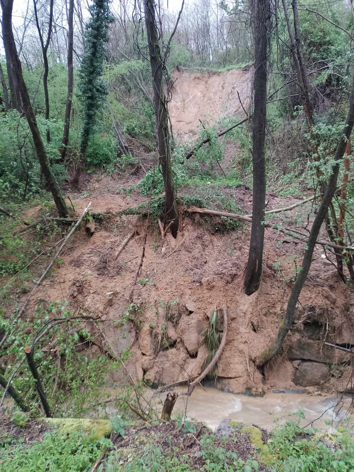 In particolare, si nota un ruscello che ha scavato profondamente la sede stradale, trasformandola in un canale di scolo improvvisato. Il tratto colpito è disseminato di detriti, ghiaia e rami, segni evidenti della forza dell’acqua. Ancora più preoccupante è il crollo di una porzione di pendio boschivo, dove il terreno ha ceduto lasciando radici scoperte e alberi pericolanti.