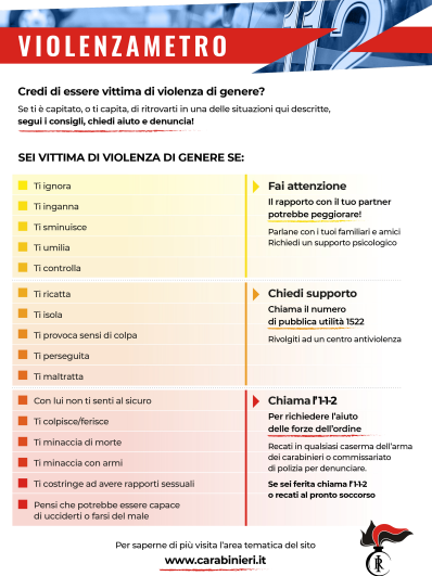 Sul sito istituzionale dell’Arma è disponibile una sezione interamente dedicata al Codice Rosso, che offre informazioni dettagliate sul fenomeno e sugli strumenti di tutela. Tra i contenuti, anche il test di autovalutazione “Violenzametro”, pensato per aiutare a riconoscere i segnali di violenza all’interno della relazione di coppia.