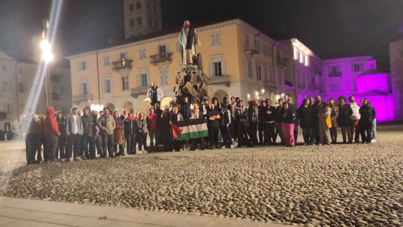 Biella, mercoledì sera. Una sessantina di persone si sono radunate in Piazza Duomo per un picchetto di solidarietà con la popolazione palestinese. L’iniziativa, inserita nel contesto delle recenti mobilitazioni internazionali per chiedere lo stop ai bombardamenti su Gaza, ha assunto un forte valore simbolico: la Fontana del Mosè, realizzata nel 1885 dallo scultore biellese Giuseppe Bottinelli e che domina il centro della piazza, è stata avvolta in una grande bandiera della Palestina.