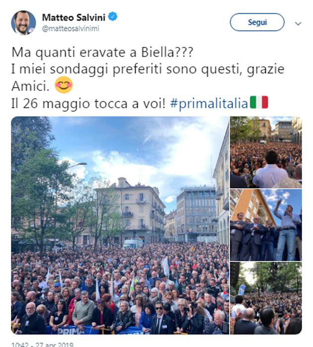 Durante il comizio in piazza a Biella la folla ha applaudito il leader della Lega e Ministro degli Interni, più volte, soprattutto quando ha parlato di lavoro e di garanzie innanzitutto “per gli italiani”. Un forte assist è andato al candidato sindaco Claudio Corradino (“anche se interista e a anche se non è bello”, ha detto Salvini) che, emozionato, è tornato a spiegare come la sua esperienza di amministratore sarà fondamentale per la città. Salvini ha poi detto che se “vinceremo anche in Piemonte la nostra attenzione sarà per la sanità, l’agricoltura e le infrastrutture in attesa che faremo tutte”, ma ha dimenticato di citare la Pedemontina, fondamentale per togliere dall’isolamento stradale il Biellese. Ha poi chiuso il comizio con i tradizionali selfie con una trentina di fans presenti: giovani e anziani, anche famiglie. Fra le migliaia di persone presenti molti i seguaci del ministro degli Interni, molti i curiosi, mentre durante il comizio alcuni giovani di colore sono passati sotto il portico di piazza Vittorio applaudendo ironicamente il ministro mentre un gruppo ha sventolato striscioni con la scritta “Fuori i fascisti dalla città”.