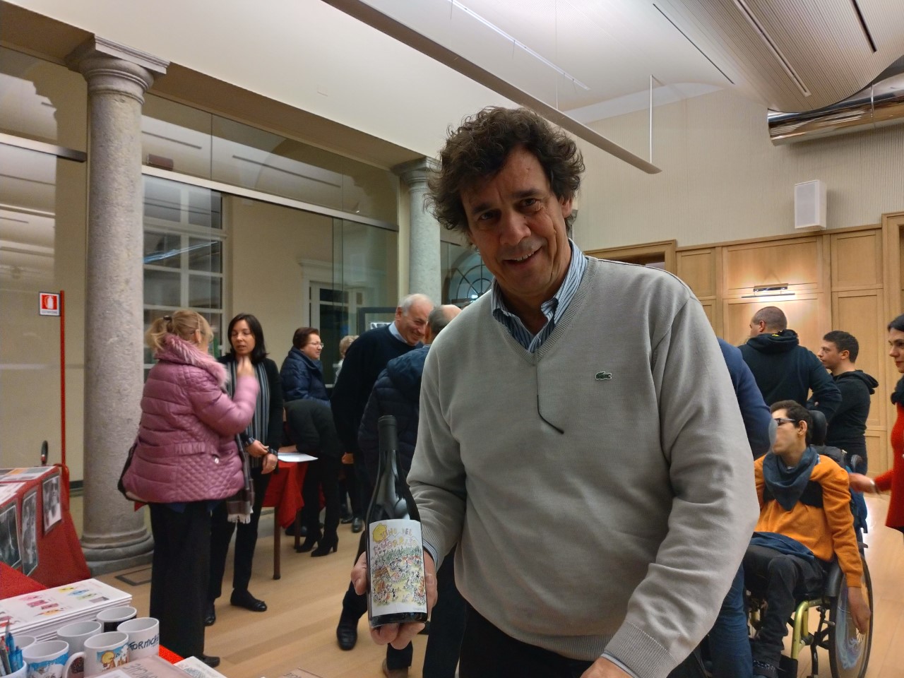 Davanti ad un folto pubblico, la presidente Valeria Salussolia, la sua vice Lorella Ressia e il responsabile del vigneto in paese, Gianni Moggio, hanno presentato la nuova etichetta, creata dal disegnatore Fabio Vettori (foto), presente sulle 700 bottiglie dell’annata 2016. Il compito di vinificare, cioè la trasformazione dell’uva in vino e il suo affinamento, è dell’azienda Centovigne di Magda e Alessandro Ciccioni, presidente della Camera di Commercio.