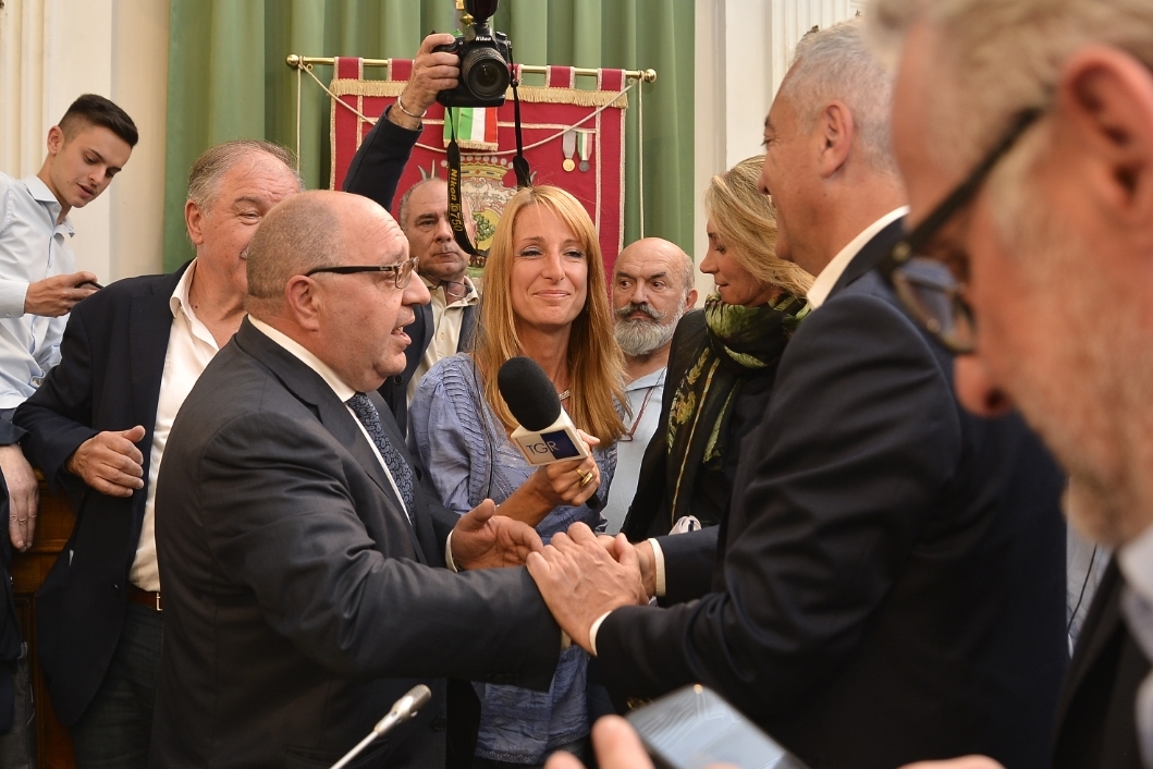 Ore 01.00 – Dino Gentile arriva a Palazzo Oropa tra gli applausi per riconoscere la vittoria di Corradino. VIDEO