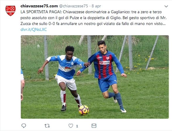 Il fair play e la Chiavazzese vincono 3-0 a Gaglianico. Al 12’ si assiste a un episodio, ormai purtroppo raro sui calcio di campo, di correttezza sportiva: Giglio segna, ma il suo gol è viziato da un fallo di mano. L’arbitro non vede l’irregolarità e assegna la rete ai blucremisi. L’attaccante non esulta e tentenna; mister Massimo Zucca, però, entra in campo e segnala al direttore di gara che la rete realizzata dal suo giocatore non è valida: il risultato resta 0-0. La Chiavazzese vince comunque l’incontro: al 24’ Giunta serve Pulze che stoppa il pallone e batte Bini. I blucremisi continuano a spingere, ma non trovano il raddoppio. Nella ripresa il Gaglianico riesce a essere più pericoloso, ma sono gli ospiti a mettere al sicuro il risultato. Al 9’ Giunta serve Giglio che stoppa il pallone e raddoppia. Alla mezzora ancora Giglio entra in area, salta un avversario e batte ancora Bini, chiudendo di fatto la partita. Nel Gaglianico, da segnalare il ritorno in panchina di Michela dopo la maxi squalifica e l’esordio dei giovani classe 2002 Cossavella e Pizzo.