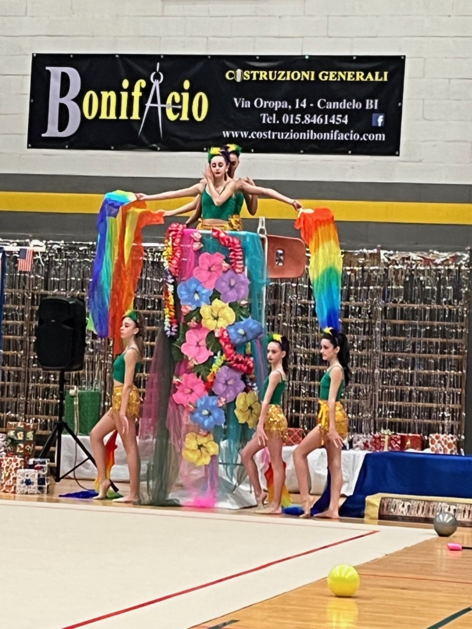 Pubblico delle grandi occasioni al Palasport candelese, che ha gremito gli spalti in ogni ordine di posti, ed inizio della Festa in perfetto orario con la discesa in pedana, in rapida successione, delle RSgirls agoniste in performances individuali, ai vari attrezzi della Ritmica, sempre più complesse e spettacolari. Al termine di questa prima parte, che ha visto diciassette atlete esibirsi a corpo libero, fune, cerchio, palla, clavette e nastro; l’ospite più atteso: Babbo Natale, presente con due piccole aiutanti, che aveva salutato il pubblico in apertura è partito, a questo punto della serata, con la sua slitta trainata dalle renne e sospinta dalla polvere magica in un fantastico viaggio intorno al mondo toccando tutti i continenti portando gioia, felicità e doni ai più piccoli che ad ogni fermata, ringraziavano Papà Natale con esibizioni e coreografie nei costumi del luogo. Si è pertanto attraversato il mare per raggiungere l’Africa, prima nelle savane e poi in Egitto; è stata poi la volta dell’Asia con l’India e poi il Giappone e la Siberia.