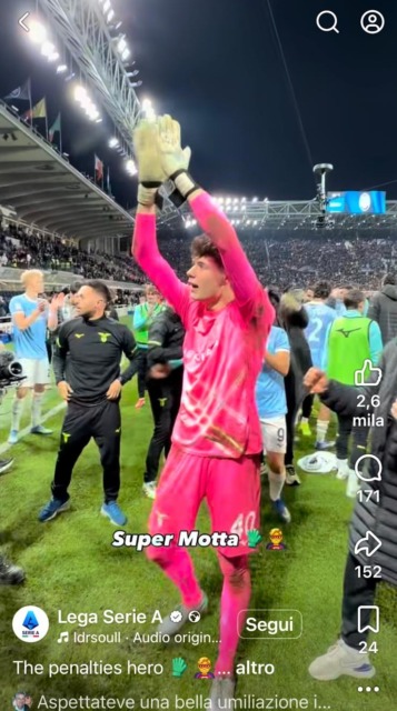 Super prestazione del portiere cossatese Edoardo Motta, che ieri sera nella semifinale di Coppa Italia tra Lazio e Atalanta ha regalato di fatto ai biancocelesti l’accesso alla finale parando ben quattro rigori consecutivi dopo l’1-1 dei tempi regolamentari e poi supplementari. Il classe 2005 ha chiuso la serranda a Scamacca, Zappacosta, Pasalic e per ultimo De Ketelaere, compiendo tutte belle parate.
