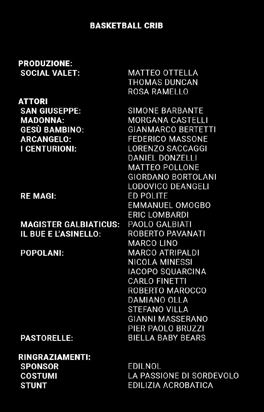 E chissà che alle Finali di Coppa Italia del marzo 2020 non ci sia una sorpresa sulla maglia Edilnol, sponsor anche di questa bella iniziativa con The Social Valet ed Edilizia Acrobatica, quest’ultima abile nel trasformare Federico Massone nell’arcangelo Gabriele. L’angelico play, prima di guidare i buoni sul campo, è in volo sopra la capanna, in cui l’infortunato Gianmarco Bertetti è diventato un perfetto Gesù Bambino prestato ad una storia nella quale il pallone da basket, donato dai Re Magi Omogbo, Polite e Lombardi, diventa oggetto conteso dai centurioni romani, guidati dal cattivo Lorenzo Saccaggi. Un minuto di “partita” tutto da godere. Caratteristi navigati, Galbiati e Saccaggi sono da rivedere assolutamente in più scene in un già atteso sequel, magari girato a Sordevolo sul set della Passione… ma a giorni è previsto il rilascio di un divertente video di backstage lungo sei minuti. Da vedere.