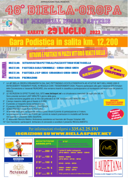 Sabato torna la Biella – Oropa e sono previste grandi sfide: la storica corsa su strada verso il Santuario della Madonna d’Oropa, che quest’anno è arrivata alla sua 48esima edizione, è in programma il pomeriggio del 29 luglio, organizzata dal GAC Pettinengo. L’evento è anche il 18° memorial Ismar Pasteris, fondatore della gara, e per gli atleti della regione avrà anche validità per il trofeo CorriPiemonte del quale è nona prova. Tutto questo con il patrocinio della Città di Biella e in collaborazione con l’Amministrazione del Santuario di Oropa, oltre che sotto l’egida della Fidal, federazione Italiana Atletica Leggera